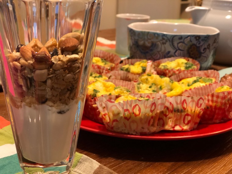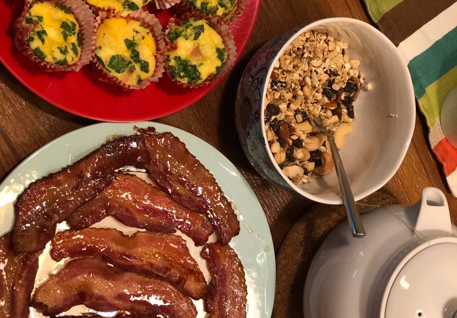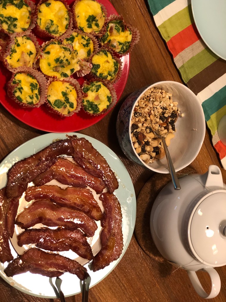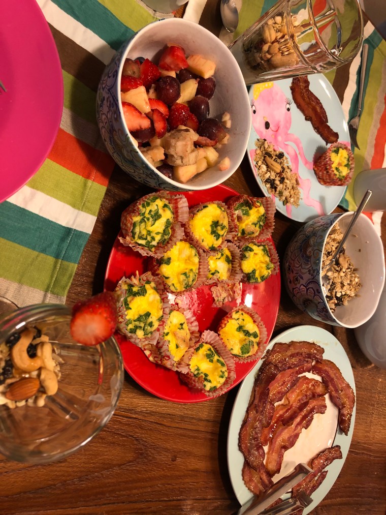 I asked them again what they wanted to make for breakfast. They told me they already planned the menu. It included triangle sandwiches with orange and pomegranate cream cheese, spinach and bacon frittatas, maple bacon, fruit salad, granola yoghurt parfait, and tea.