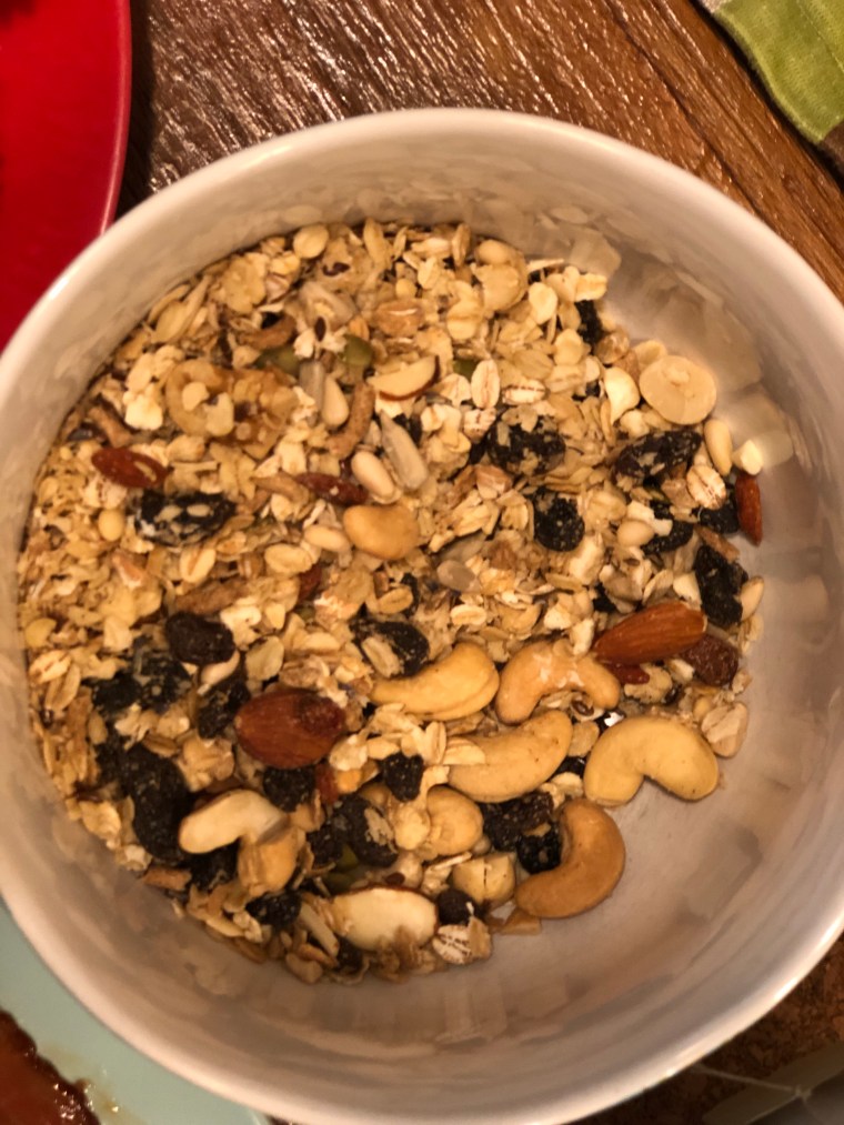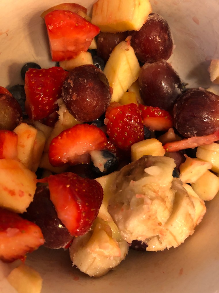 J and I baked the bacon and brushed it with maple syrup. In a pan, she melted butter, and added cashews and white chocolate chips to pre-made granola. Then she scooped the combination into parfait glasses, layering them with plain Greek yogurt, fresh strawberries, frozen raspberries, and the orange honey we got from Tasmania. Finally, she diced some apples and mixed them together with fresh strawberries, frozen grapes, and frozen bananas.