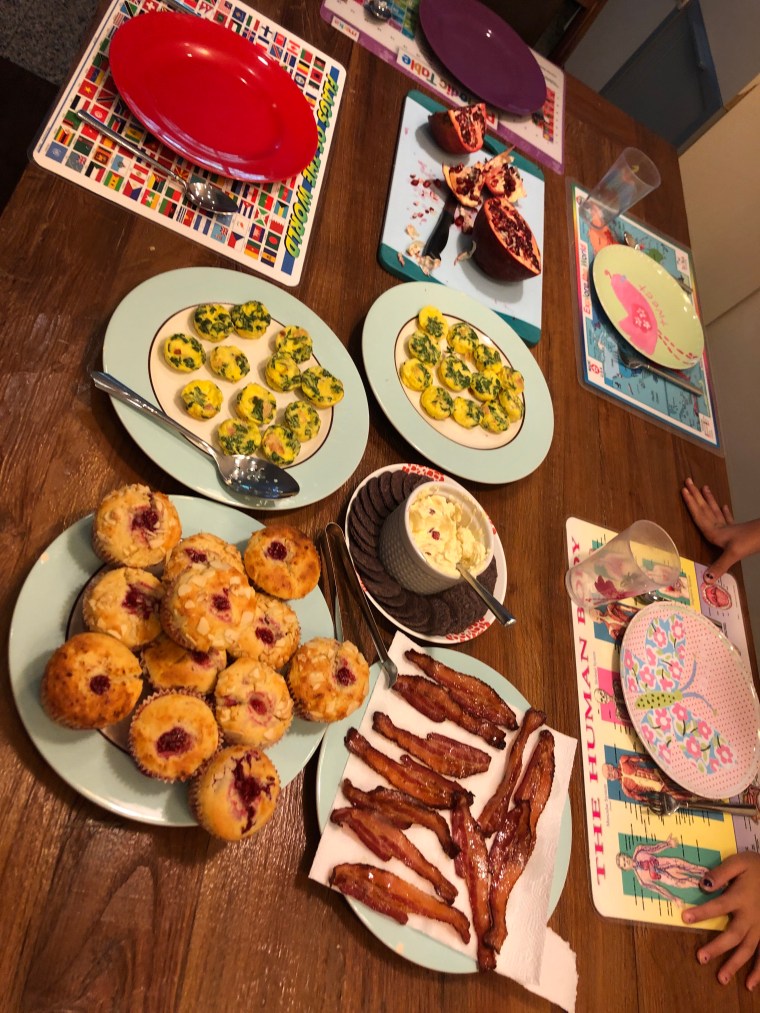 Noel is home after two weeks out of the country. Our daughters were so excited to show off what they learned to make. On the menu: spinach and bacon frittatas, maple bacon, raspberry jam muffins, and orange and pomegranate cream cheese with crackers.
