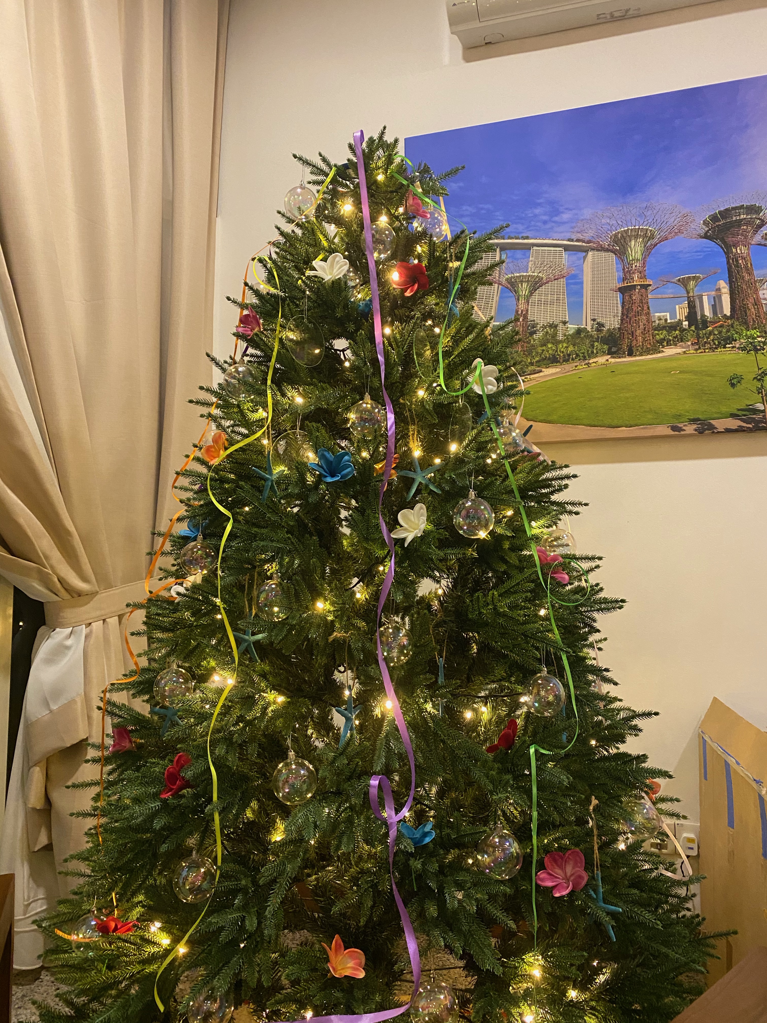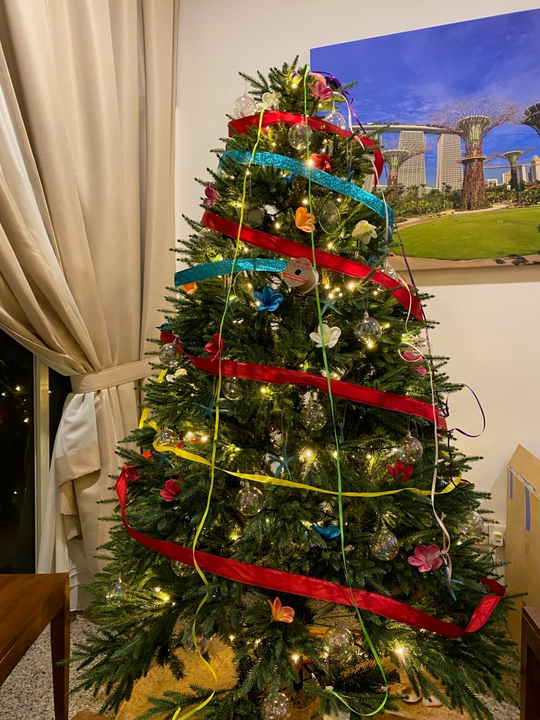 To be fair, I tried all sorts of ribbons on the tree, and they didn’t look great. I didn’t have enough of one ribbon to wrap around the tree. I also didn’t feel like going to the store.
