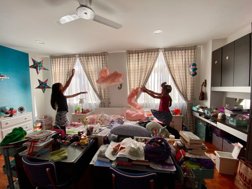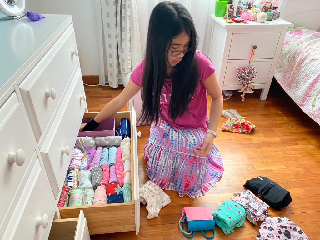 They also organized their closets and several dusty boxes of old letters, memorabilia, and school/art/writing stuff from the toddler years to the present. This was a huge undertaking that helped them take stock of their work. To maintain their energy and attention, we watched video tutorials by Marie Kondo and space makeovers by the Home Edit gals on Netflix.